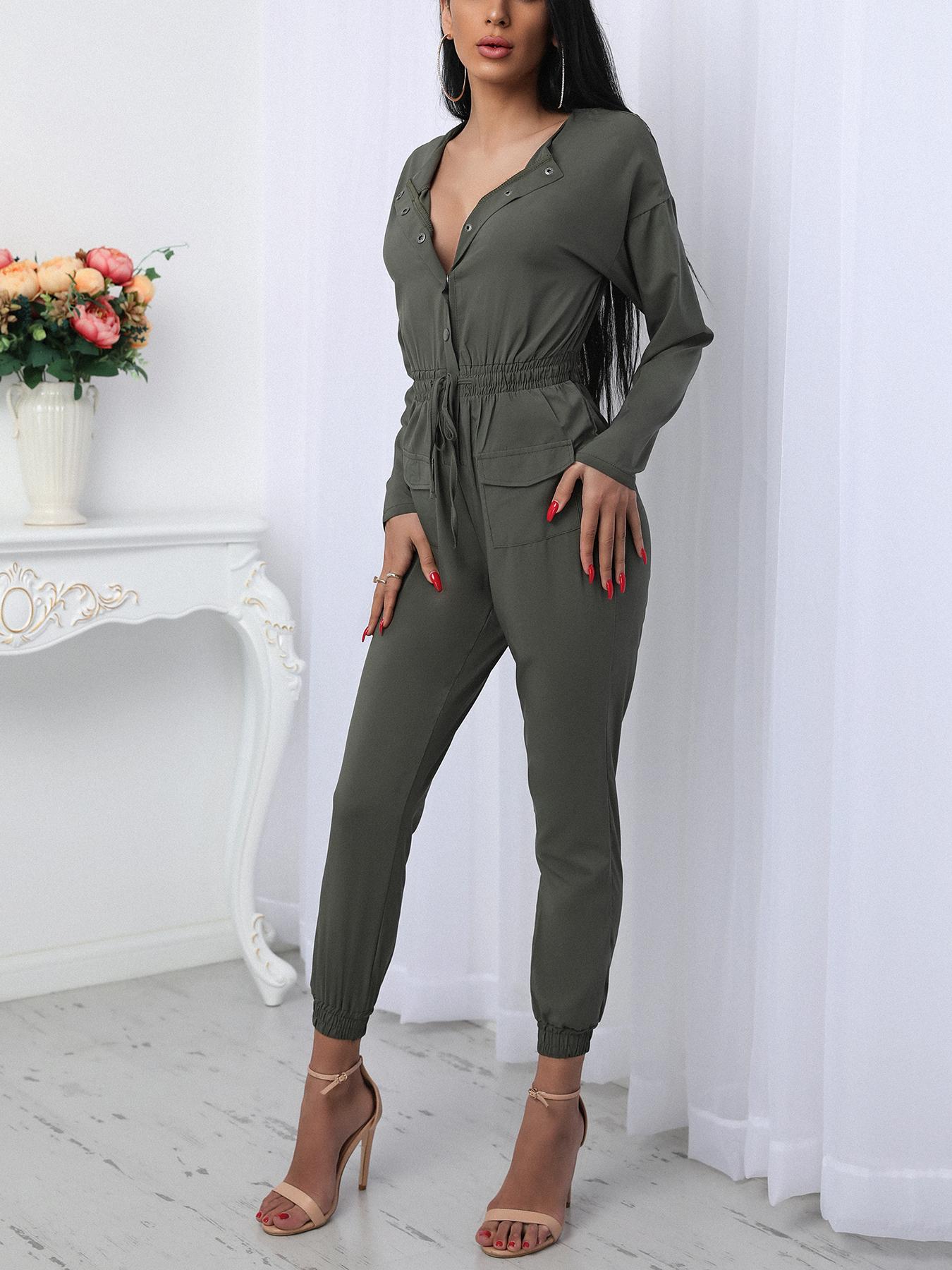 Solid Button Drawstring Deep V Puff Leg Jumpsuit, Green