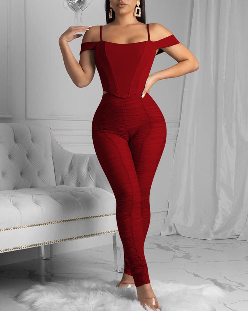Solid Cold Shoulder Ruched Top & Pant Set, Wine red