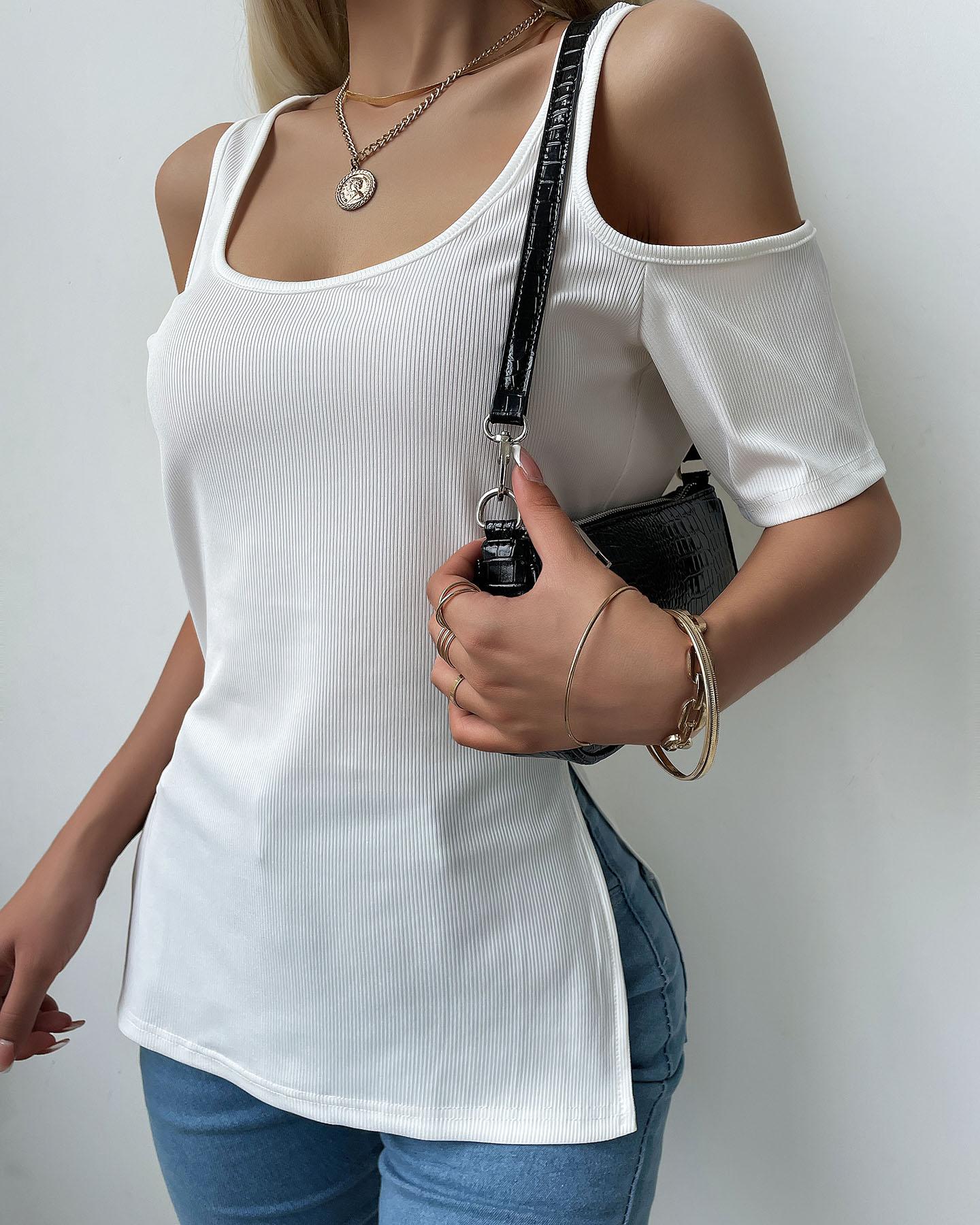 Solid Cold Shoulder Split Hem Ribbed Top, White