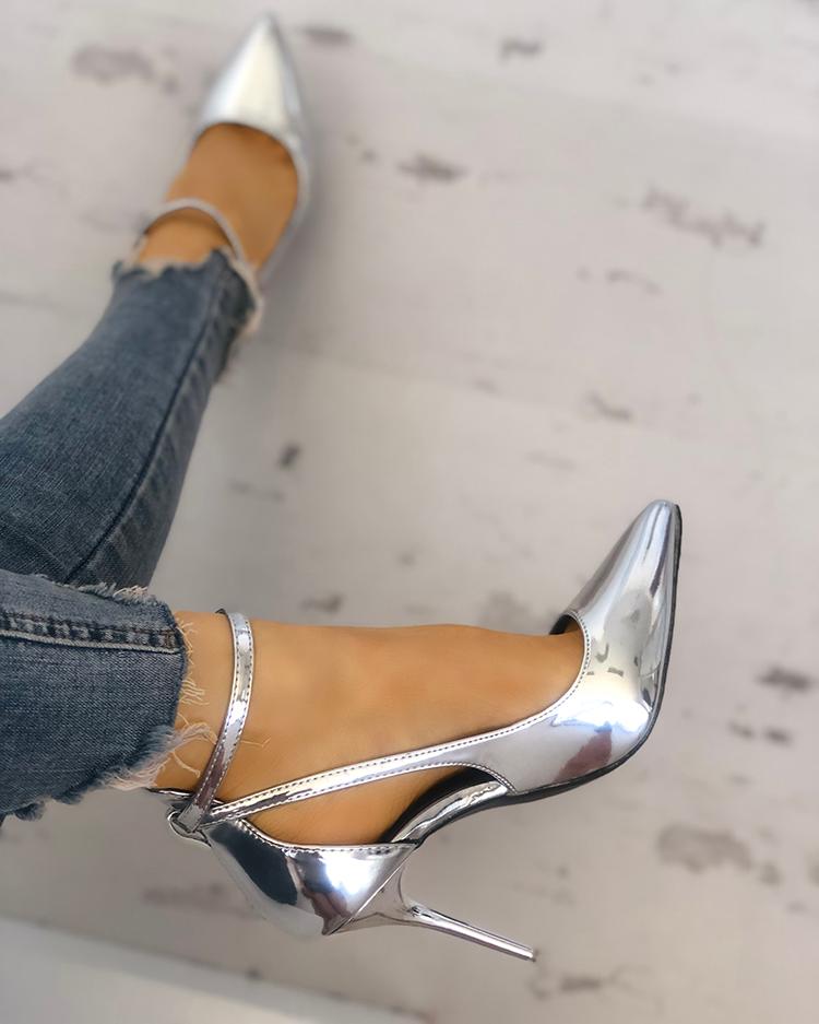 Solid Color Buckle Cutout Pointed Toe Heels, Silver