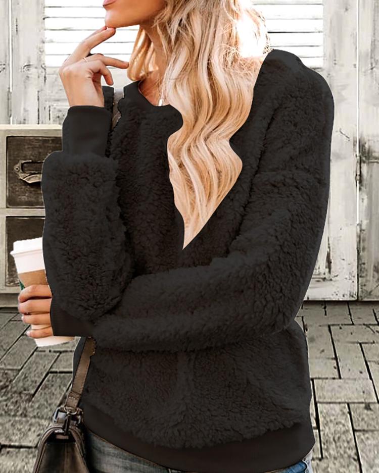 Solid Fluffy Round Neck Sweatshirt, Black