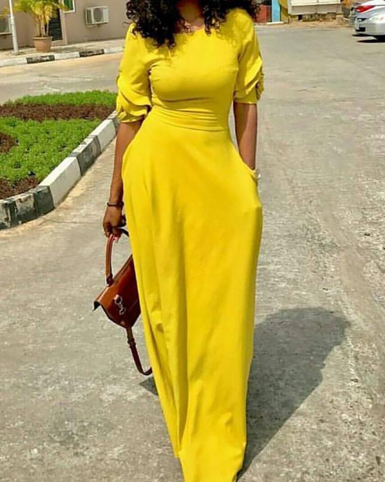 Solid Half Sleeve Pocket Design Dress, Yellow