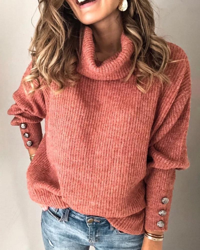 Solid High Neck Popper Cuff Long Sleeve Ribbed Knitting Sweater, Red