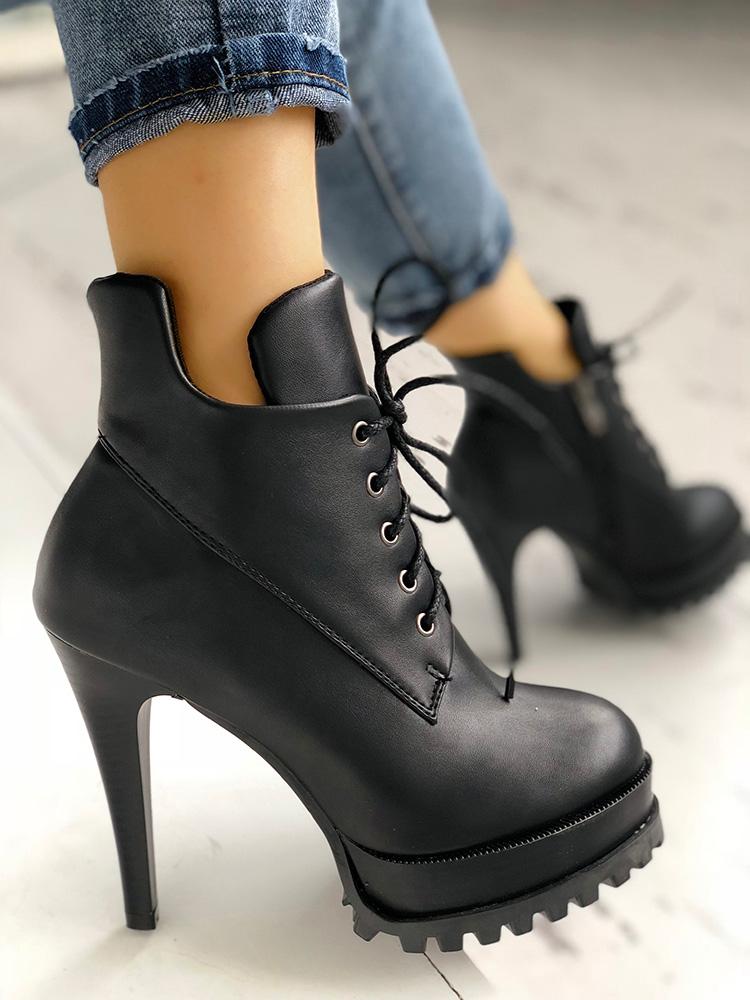 Solid Lace-Up Eyelet Platform Thin Heeled Boots, Black