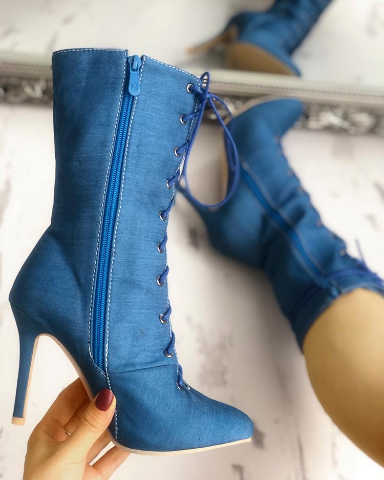 Solid Lace-Up Eyelet Pointed Toe Heeled Boots