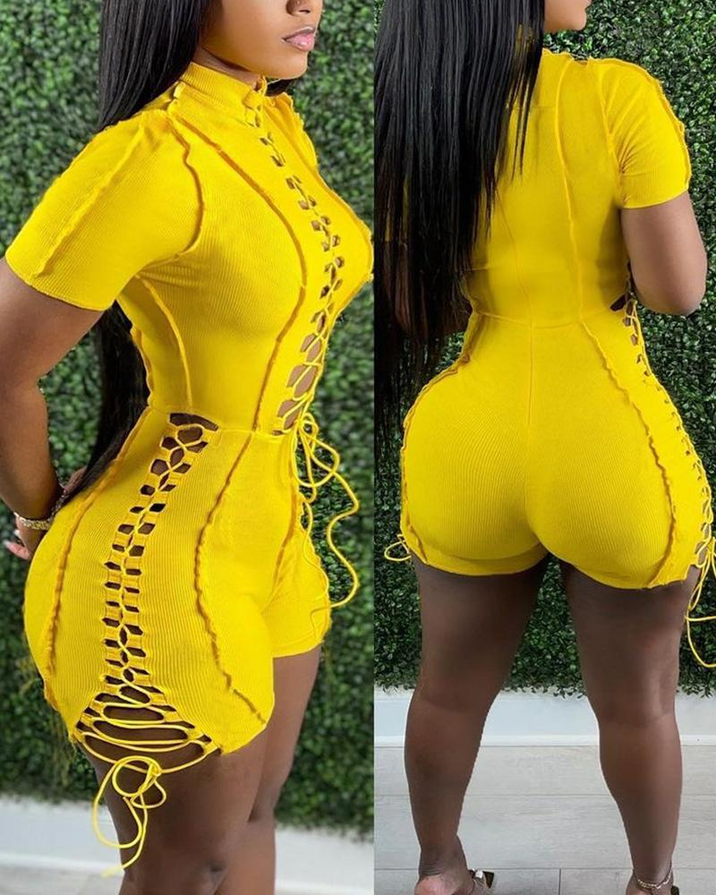 Solid Lace-up Ribbed Romper, Yellow
