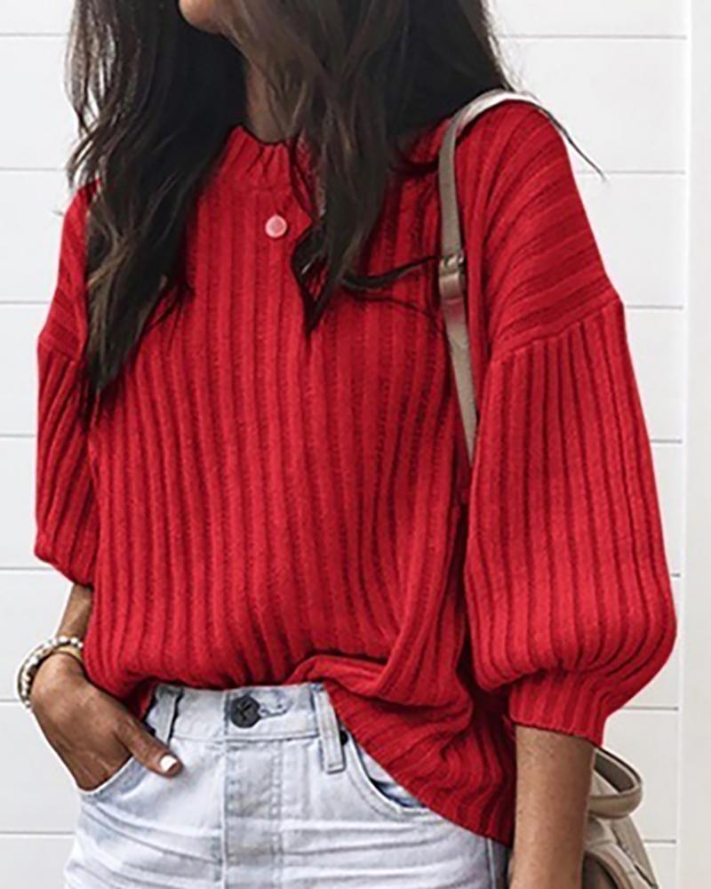 Solid Lantern Sleeve Ribbed Casual Sweater, Red