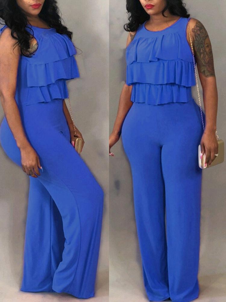 Solid Layered Ruffle Design Wide Leg Jumpsuit