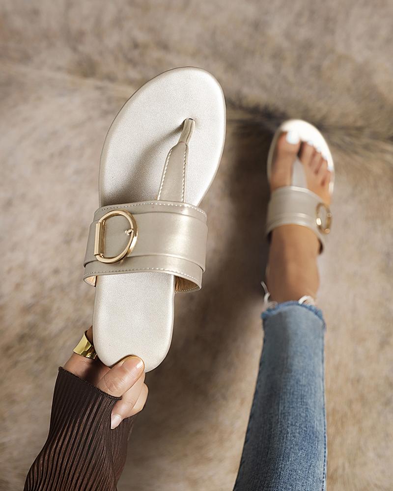 Solid Metallic Buckle Patch Post-toe Flat Sandals, Gold