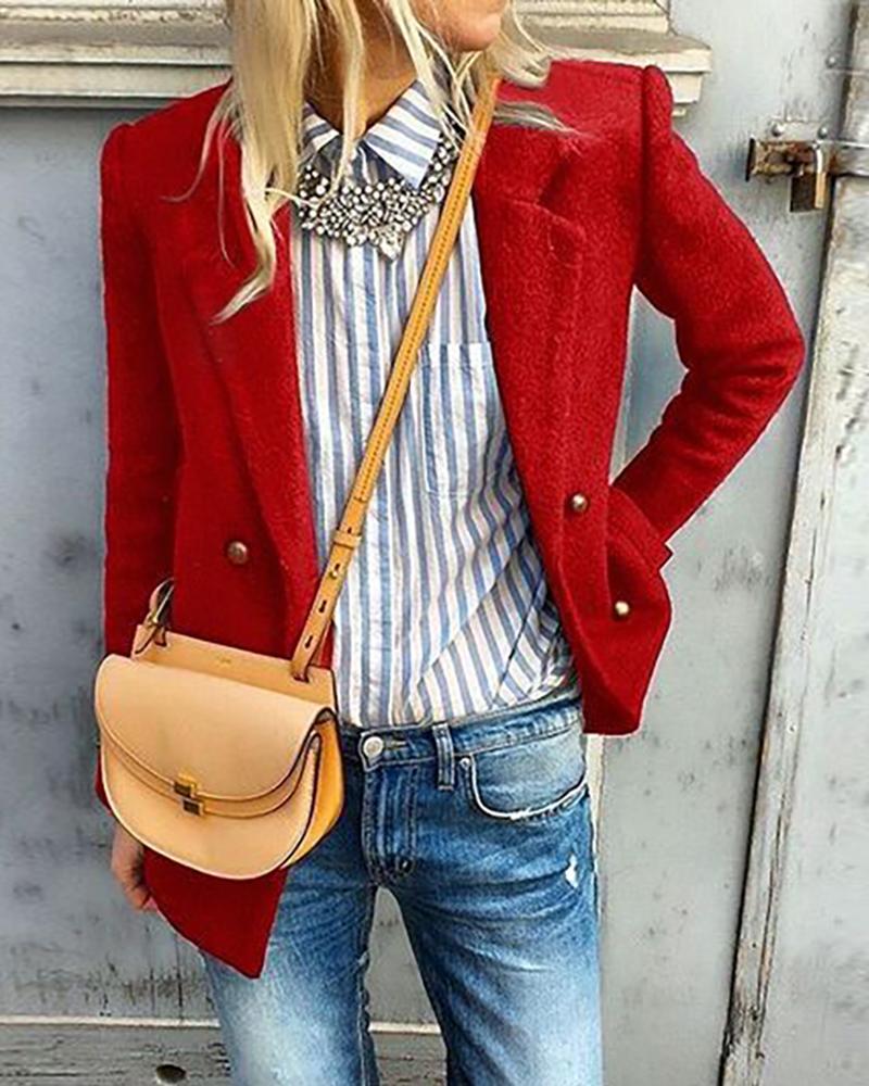 Solid Notched Collar Button Design Fluffy Blazer, Red