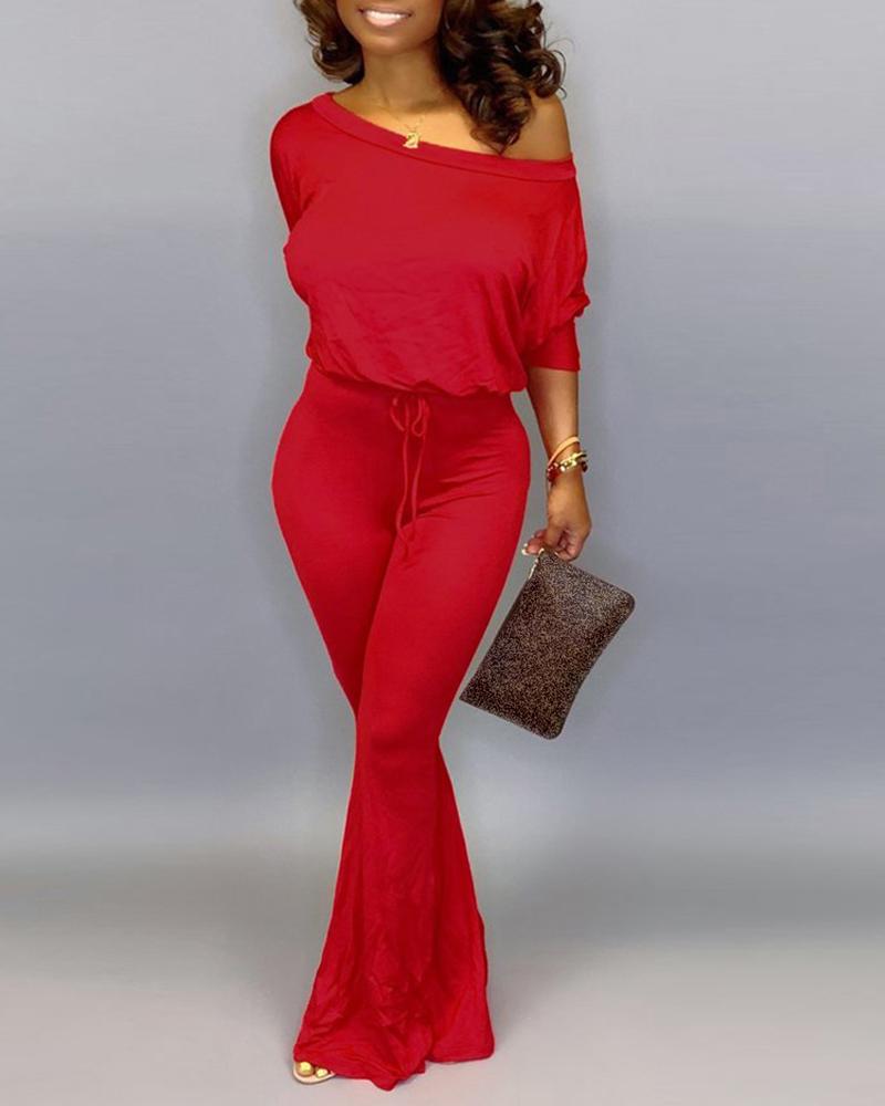 Solid Off Shoulder Batwing Sleeve Drawstring Jumpsuit, Red