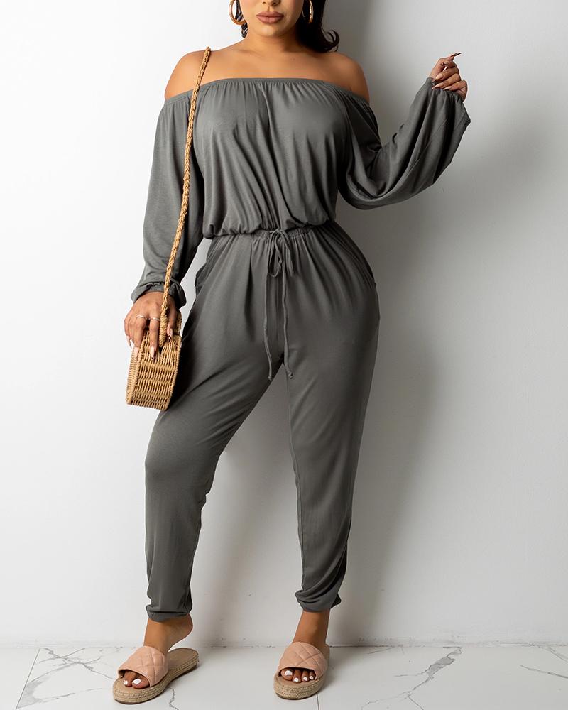 Solid Off Shoulder Drawstring Jumpsuit, Gray