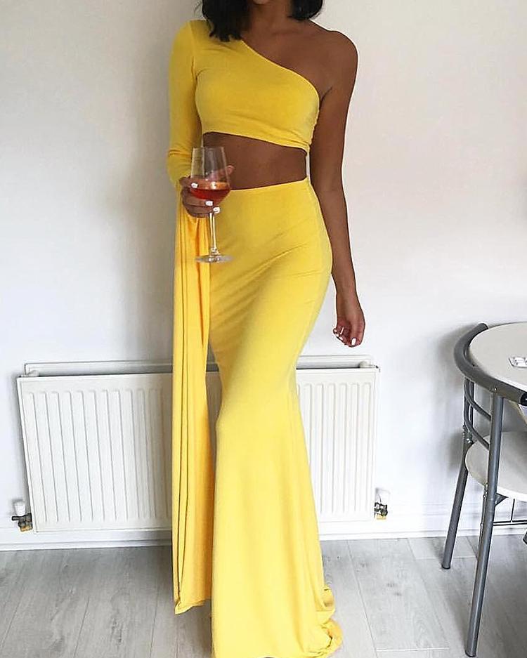 Solid One Shoulder Crop Top & Slinky Fishtail Skirt Sets, Yellow