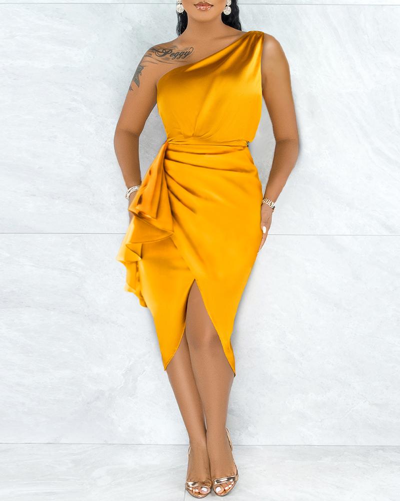 Solid One Shoulder Ruched Split Ruffle Hem Satin Dress, Yellow