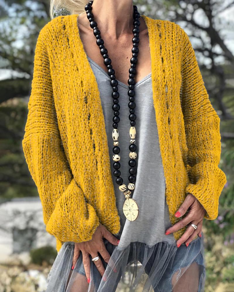 Solid Open Front Hollow Out Knitting Cardigan, Yellow