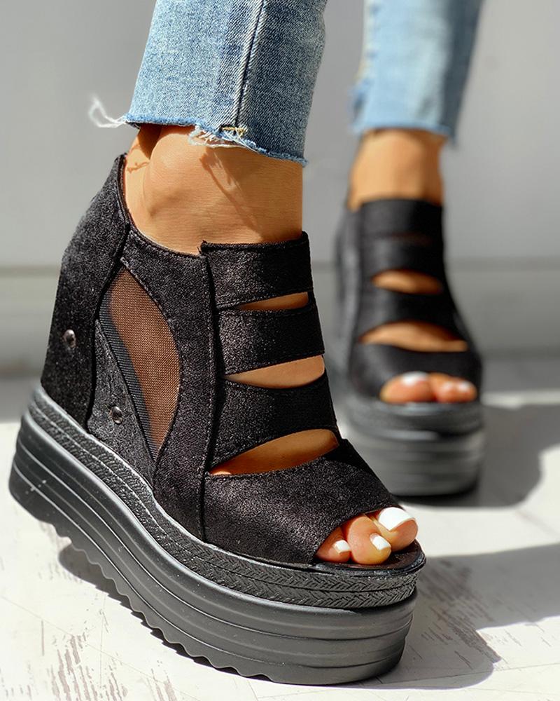 Solid PU Hollow Out Platform Sandals, Black