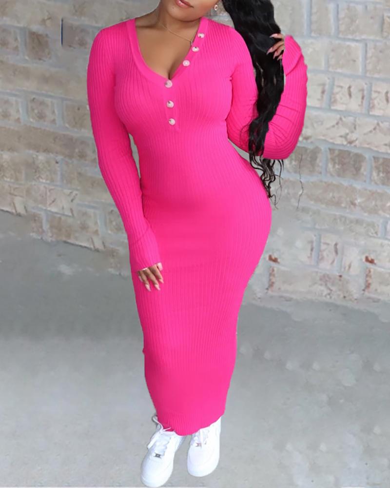 Solid Ribbed Buttoned Sweater Dress, Hot pink