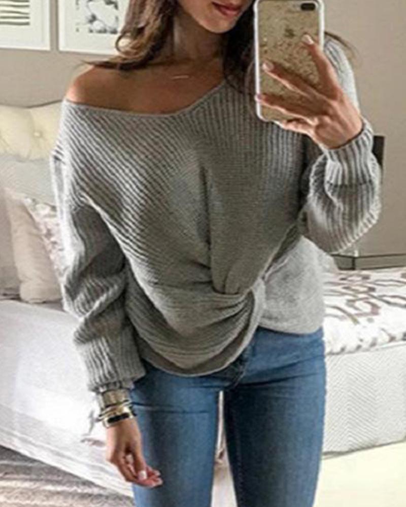 Solid Ribbed Knit Long Sleeve Sweater, Gray