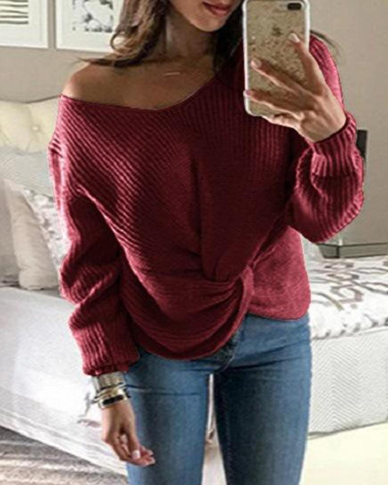 Solid Ribbed Knit Long Sleeve Sweater, Red
