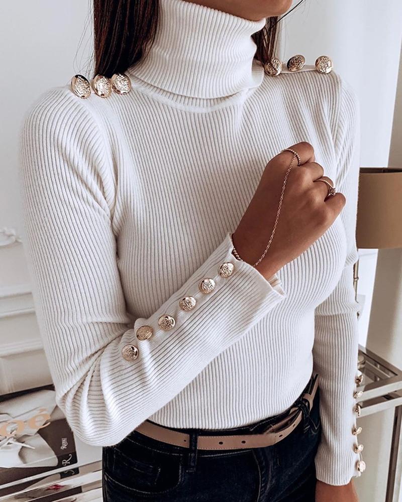 Solid Ribbed Metal Buttoned Casual Sweater, White