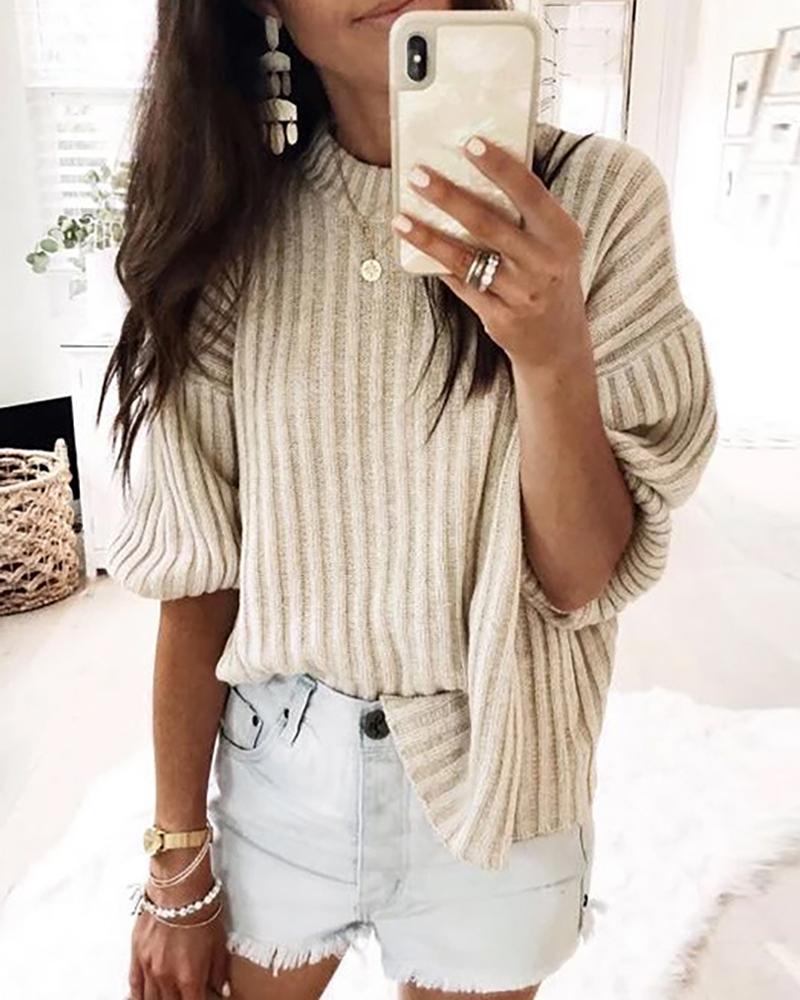 Solid Ribbed Round Neck Sweater, Beige