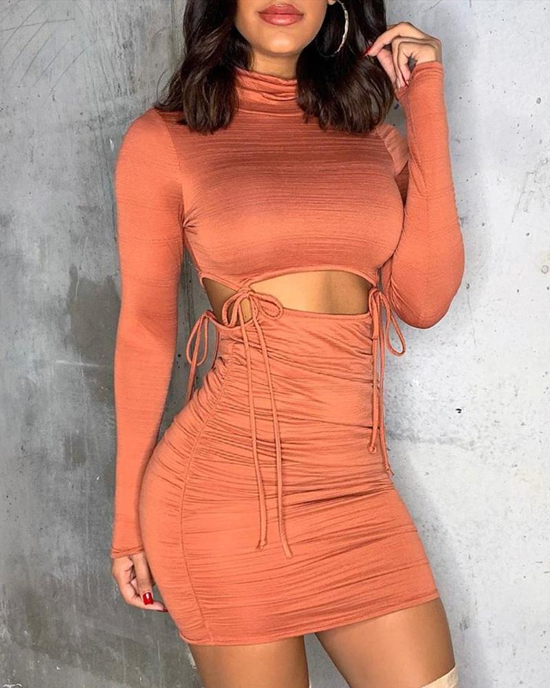 Solid Ruched Drawstring Design Bodycon Dress, Orange