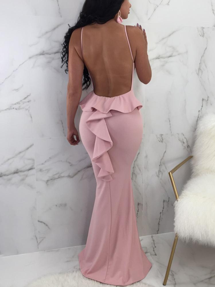 Solid Ruffles Backless Fishtail Maxi Dress, Pink