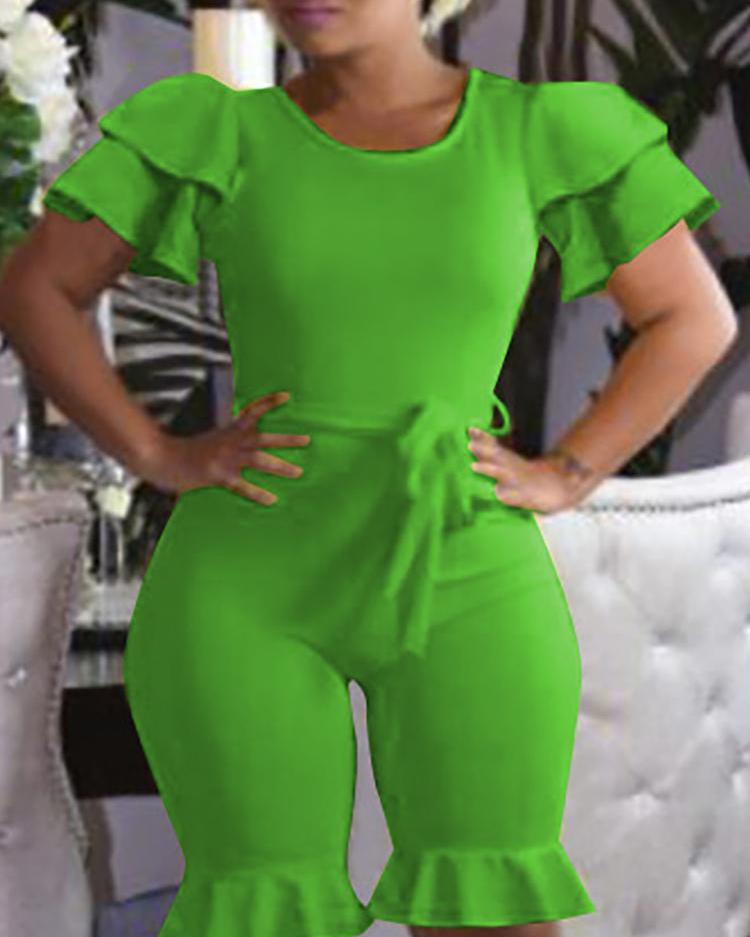 Solid Ruffles Design Belted Rompers, Green