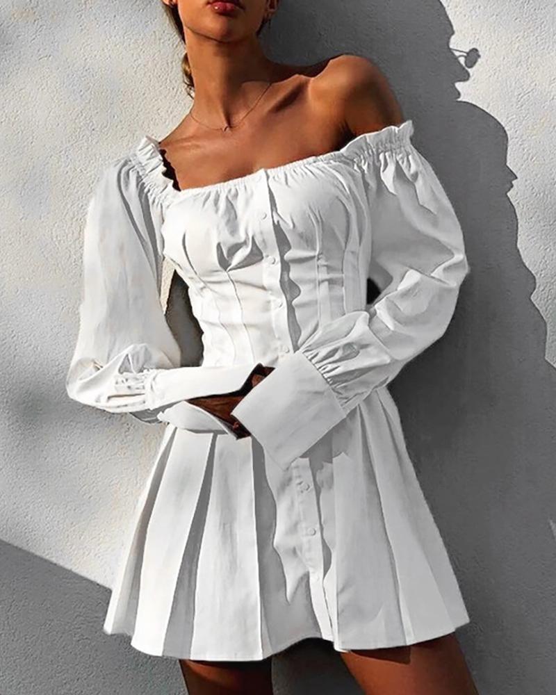 Solid Ruffles Detail Buttoned Ruched Shirt Dress, White