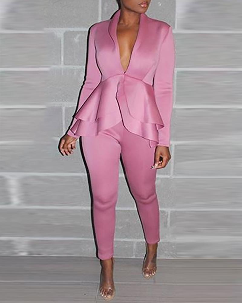 Solid Ruffles Tight Waist Top & Pencil Pants Sets, Pink