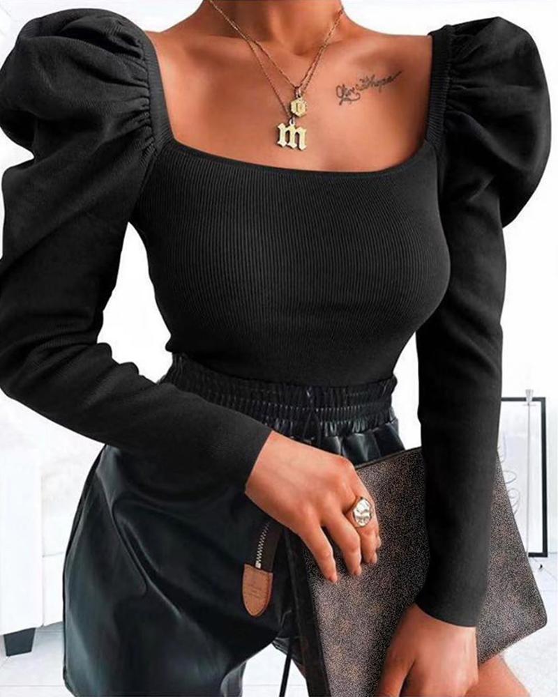 Solid Square Neck Puff Sleeve Ribbed Blouse, Black