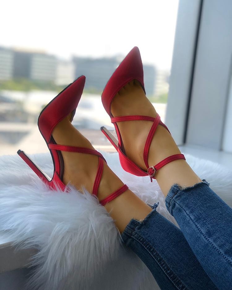 Solid Strappy Buckle Pointed Toe Heels, Red
