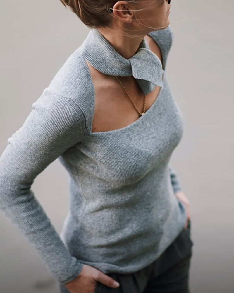 Solid Tied Neck Cut Out Ribbed Knitting Sweater, Gray