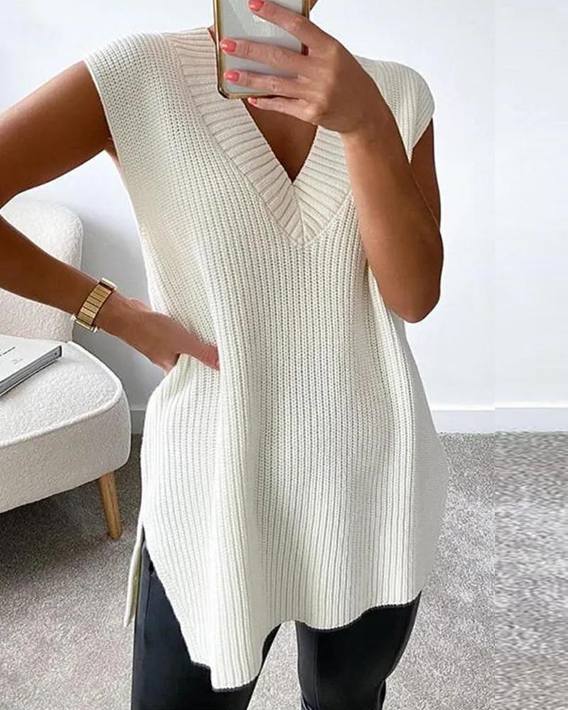Solid V-Neck Split Hem Ribbed Knit Sweater Vest, Beige