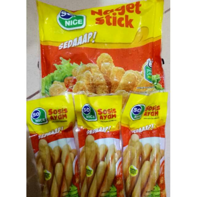 Nugget stik kemasan 250 gr dan 3 sosis kemasan masing-masing 75 gr