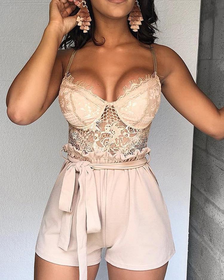Spaghetti Strap Eyelash Lace Insert Rompers, Beige