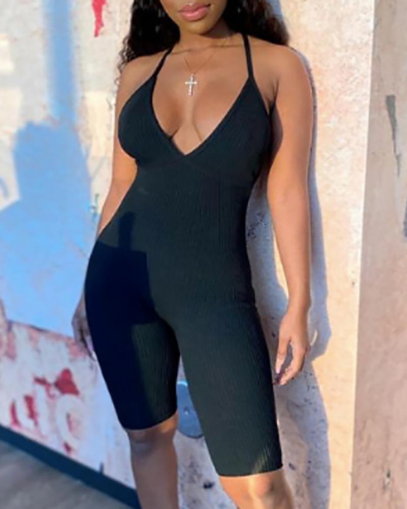 Spaghetti Strap Halter Backless Ribbed Romper, Black