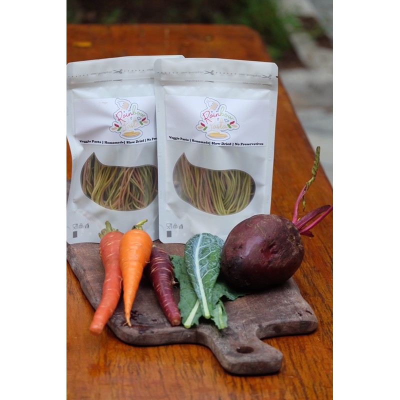 Spaghetti kering rainbow mix dari sayuran organik (beet, wortel, kale). Dikeringkan dengan proses slow dried suhu rendah . Dibuat tanpa pengawet, pewarna buatan, atau pengenyal.