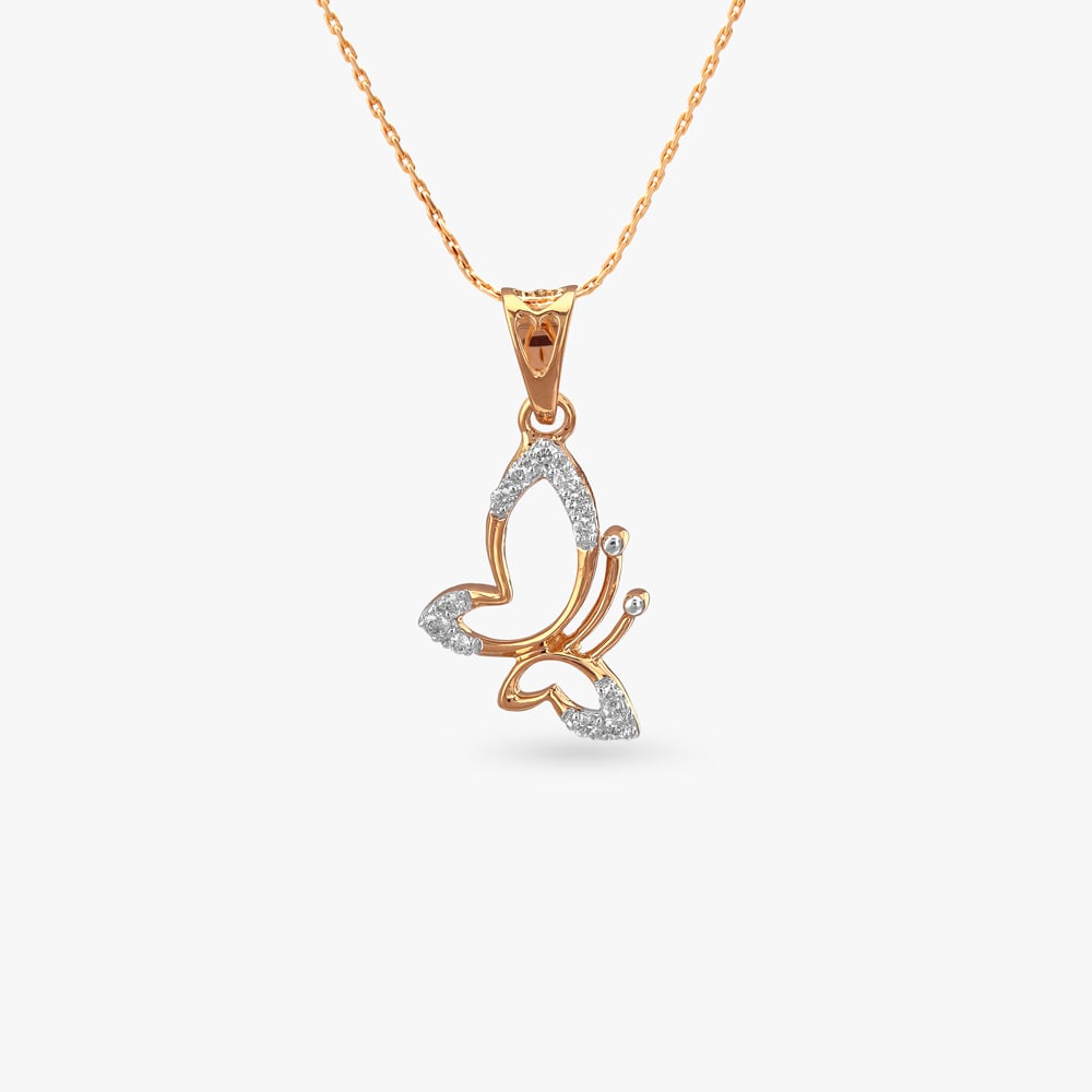Flutter into elegance! This 18 Karat yellow gold butterfly Pendant is adorned with shimmering Diamonds on its wings, capturing the essence of delicate beauty in motion. | TANISHQ