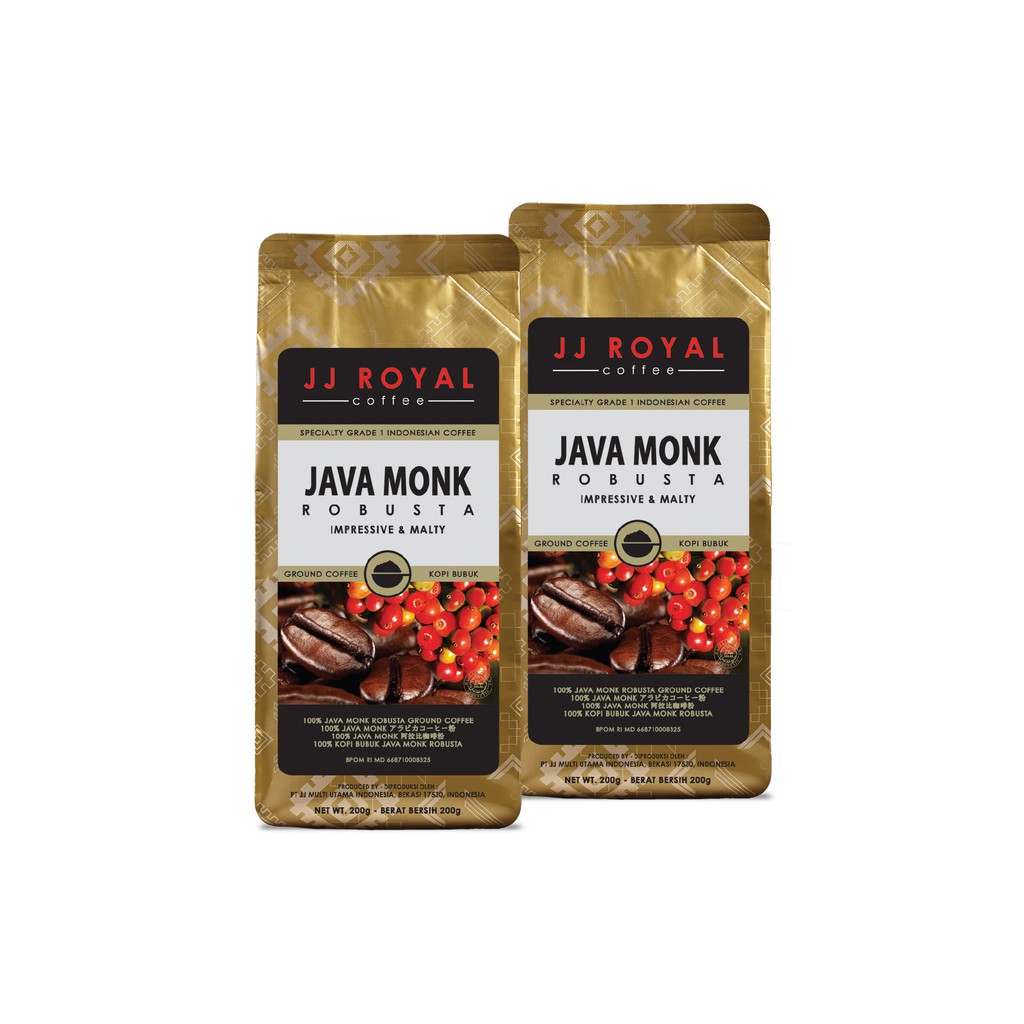 Kopi JJ Royal Java Monk Robusta menggunakan biji kopi premium yang ditanam dan dipanen oleh para biarawan di dataran tinggi yang tenang di sebuah kawasan biara di Jawa Tengah. Jenis kopinya menghasilkan aroma malt dengan sedikit aroma cokelat yang mengesankan; Pengalaman langka, kaya dan menyenangkan dapat anda nikmati di setiap cangkir Kopi JJ Royal Monk Robusta