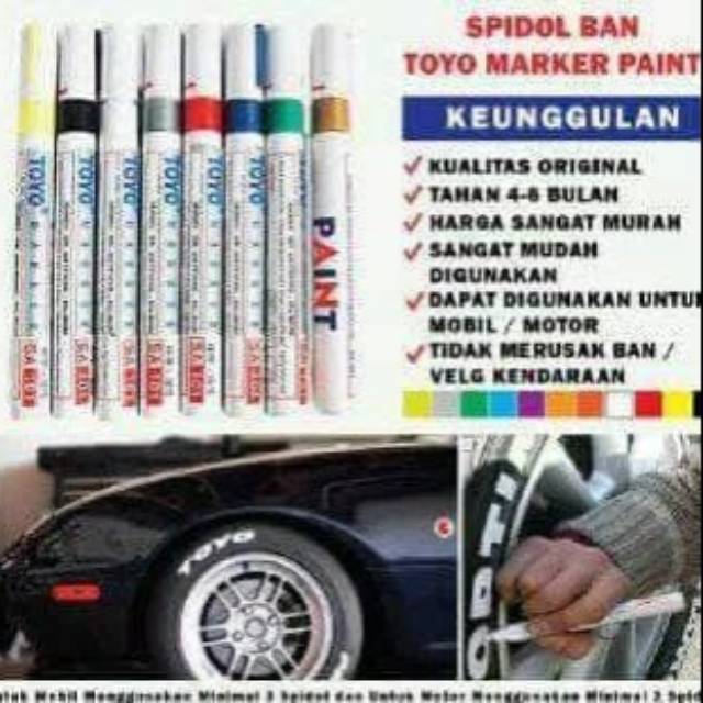 Spidol keren ini bisa menambah keren ban kendaraan juragan sekalian. Karena Spidol ini bisa mewarnai ban kendaraan sesuai motif yang diinginkan. Jadinya ban juragan akan "Never Be The Same Again"..halah. Hasilnya kuat menempel seperti upil kering yang ada di bawah meja. Tidak luntur kena hujan maupun hilang ketika ban disemir. Mantab kan!!! Langsung aja beli sekarang mumpung harga belum turun. Walaupun belum punya kendaraan pribadi, minimal beli ban nya aja dulu trus corat-coret dah hehehe. BARANG DIJAMIN HALAL..EH ORIGINAL 100%!!!