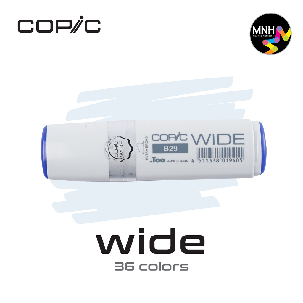 COPIC WIDE ULTRAMARINE. Copic Wide adalah pilihan optimal untuk mewarnai area yang luas dengan guratan yang konsisten. Muncul dengan ujung lebar 21mm. Jika tinta Copic Wide mu habis, kamu juga bisa mengisi ulang kembali dengan Various Ink.