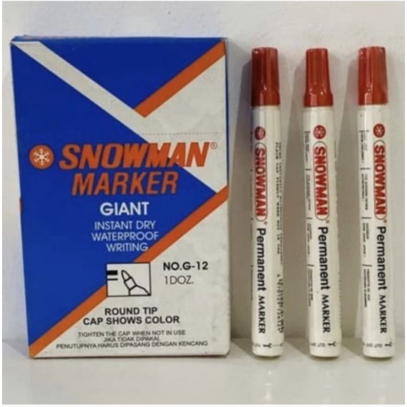 *Spidol snowman G-12 adalah spidol permanen yang tidak dapat di hapus bisa di gunakan untuk menulis di dus kaca ataupun benda lainnya anti kering tinta dengan kualitas tinggi barang di jamin asli sama seperti di foto 100%harga satuannya 9000 per spidol barang rusak saat sampai atau pun saat pengiriman kami ganti dengan yang baru begitu pun bila kemasan produk terbuka atau sobek barang sudah kami cek terlebih dahulu sebelum di kirim pesanan akan kami proses dan kirim langsung pada hari yang sama tapi jika pesanan melewati jam 1 siang pesanan akan kami proses dan kirim pada esok hari jadi silakan di pilih dan klik beli di bawah ini