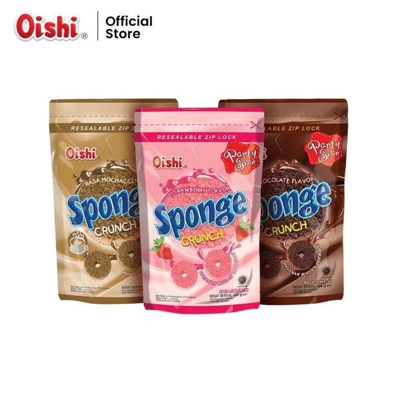 Oishi Sponge adalah snack dengan bentuk sponge lingkar yang unik. Tersedia dalam 3 varian rasa: Coklat, Stroberi, dan Mochaccino. Tekstur sponge yang renyah dan rasa yang manis semakin menambah unik snack dari Oishi ini. Oishi Sponge Crunch hadir dalam kemasan yang praktis dan higienis serta dilengkapi dengan resealable zip lock untuk menjaga kerenyahan sponge crunch di dalamnya.