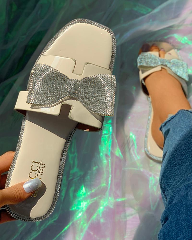 Square Toe Bowknot Pattern Rhinestone Flat Sliders, Beige