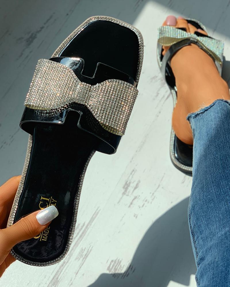 Square Toe Bowknot Pattern Rhinestone Flat Sliders, Black