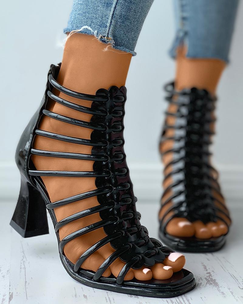 Square Toe Multi Strap Pyramid Chunky Heels, Black