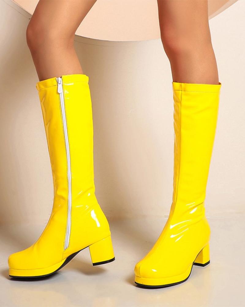 Square Toe Side Zipper Chunky Boots, Yellow