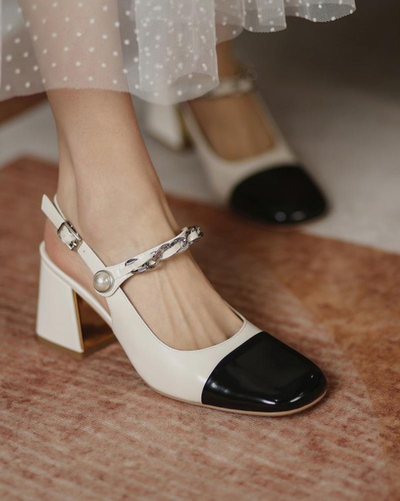 Square-toe Color Block Splicing Chain Buckle High Heels, Apricot