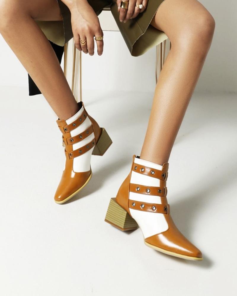 Square-toe Solid Color Splicing Buckles Biker Boots, Yellow